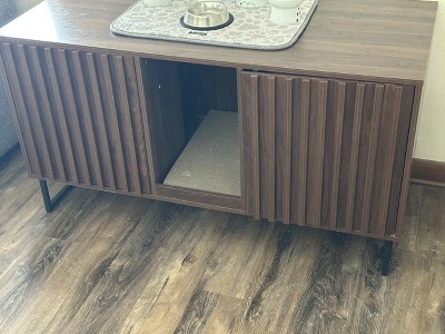 Buyer beware- A completely different item was shipped to me. Does not match the picture or description at all. Due to timing (urgent need to get it up before the holidays) I just kept it and although the design is not at all as described or pictured. It is functionally okay so far. The little magnet hinges constantly fall off when closing the door which is annoying. I recommend finding high sided litter boxes to fit in the cabinet to reduce mess inside the cabinet.