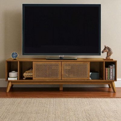 55" Rattan TV Cabinet with Double Sliding Doors, Modern Farmhouse Media Console with Adjustable Shelf and Solid Wood Legs for Living Room