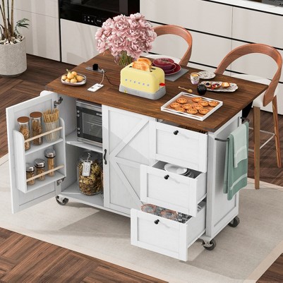 This stunning farmhouse-style kitchen island combines rustic charm with modern functionality, making it a versatile and stylish centerpiece for your kitchen or dining space. It features X-patterned barn doors with spliced wood strips and vintage metal accents while the distressed cabinets and brown wood grain countertop create a cozy, inviting atmosphere that complements any decor. With a 47” drop-leaf countertop, the island provides flexible workspace that can be expanded when needed or folded down to save space. A built-in power station with 2 AC outlets and 2 USB ports offers convenient access to power for your appliances, so you can easily charge your coffee maker, blender, or phone on the spot. The interior storage racks, inspired by refrigerator doors, include two-tier shelving behind each barn door, perfect for storing condiments, sauces, or spices, with pine sticks to keep items secure. Besides, it includes three deep drawers and a two barn door cabinet, providing ample storage for your kitchen essentials. Additionally, this mobile kitchen island is equipped with 5 universal wheels, including two that are lockable, and a centrally placed wheel for enhanced stability, allowing you to move it easily for cleaning or rearranging. In terms of materials, built from eco-friendly P2 grade particleboard, MDF, and durable metal, it can hold up to 400 lbs on its sturdy 1" thick tabletop, making it reliable for daily use. To sum up, with a smooth-glide three-drawer design, ample barn-door storage, and a farmhouse aesthetic enhanced by metal corner accents, this island adds charm, convenience, and functionality to any culinary space.