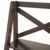 Organize and display books and décor on this stylish Four Tier Crossback Shelf. Made of sturdy wood composite in a dark brown finish, this shelf has four tiers, giving you plenty of room to show off picture frames, candles and more. Details on this shelving, including two cross-back sections and an angled, ladder-inspired design, give it a unique look. Place this shelving unit in any room, from entryways to dining rooms, to add warmth and detail while reducing clutter.
