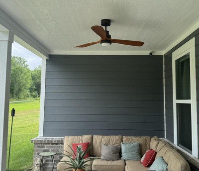 We are enjoying our new fan! It was fairly easy to install. The only difficulty we had was with programming the remote. The actual procedure in syncing the remote didn't match the written instructions. However, thru trial and error, we reached success! Love the sleek look of this beauty. The faux wood was the color we needed and the fact that it isn't real wood is not detectable. There is absolutely no sound from this fan. We haven't turned it off since the day we put it up!