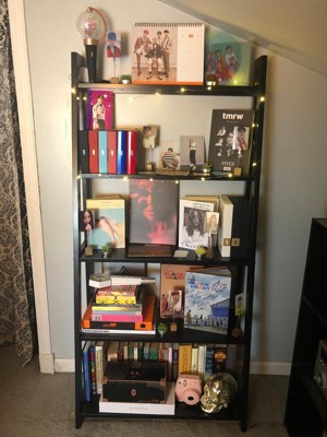 Great size and laddered design makes the bookcase seem less bulky. The wood appearance is warm and the piece was easy to assemble. The top shelf is good for small items.