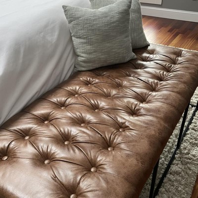 58" Draper Large Bench with Button Tufting Faux Leather Light Brown - HomePop: Upholstered Ottoman, Entryway Seating