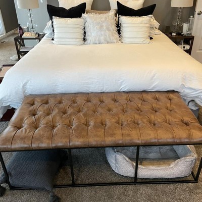 The Draper Large Ottoman exudes masculine style and can perform multiple functions in any home. Use it as a coffee table ottoman in the living room, as an end of bed bench in the bedroom, or as extra seating in the dining room or family room. This 58" ottoman features an open metal frame that offers substantial size without overwhelming the space. The light brown faux leather button tufted top adds texture that contrasts well with the sleek black metal styling of the base. Easy to maintain with spot cleaning as needed. Please note that fabric and wood colors may appear slightly different due to variations in lighting or screen settings.