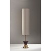 The Carmen Floor Lantern makes a strong statement in the living room. A mix of antique brass and walnut wood materials and an hourglass shaped base reveals mid-century modern style with retro influence. A textured beige tall fabric shade softens the look while three bulbs cast an even glow for the perfect mood lighting. A convenient foot step switch turns the lamp on and off. This lamp measures 59" tall and 11" round - the perfect size to brighten small spaces.