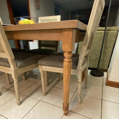 • A: This table is constructed of rubberwood in a Driftwood finish, featuring a lightly aged appearance