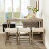 Three upholstered stools offer supportive seating, each crafted with a soft foam saddle seat covered in breathable linen fabric for lasting comfort. The sturdy rubber wood legs and reinforced frame deliver exceptional stability and durability, while the rustic faux wood grain finish adds a touch of warmth and character to any setting. Protective foot mats help guard your floors against scratches, making this set a practical choice for kitchens, apartments, or multipurpose dining areas.