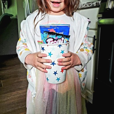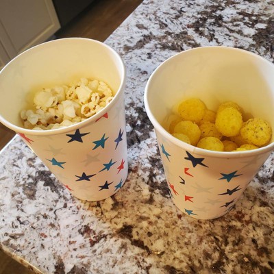[This review was collected as part of a promotion.] These popcorn buckets are large popcorn cups. They are a good size for a serving. They'll make for a cute and festive treat "baskets" for gifting to the kids during Independence Day festivities. The material is a typical paper cup with a small wax lining. They indent easily so not extremely sturdy with little kids holding them. The decorative stars design is simple, yet fun and his the mark. I received an incentive to write this review.