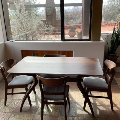 With matching wood finishes, you can’t go wrong with this Christopher Knight Home Idalia 60" Curved Leg Rectangular 5 Piece Dining Set. Including one table and four chairs, this set is ideal for any home. The mid-century style and smooth wood finishes of this set will compliment any décor, so you don’t have to worry about clashing color pallets in your home. The dining chairs feature a sturdy design with soft fabric cushioned seats, providing both comfort and style for your dining pleasure.