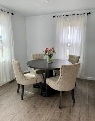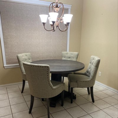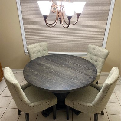 The 5pc Ariane dining set by angelo:HOME adds a chic vintage touch to any dining room. The spacious round dining table features a weathered gray finish with a striking pedestal base, constructed of durable rubberwood. The four dining chairs upholstered in a light gray linen-like fabric with tufted backs are detailed with nail head trim and coordinating weathered gray finish legs. A gorgeous set for any dining area, seating four comfortably.