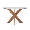 - MODERN MEETS RUSTIC: The round beveled glass tabletop, crafted from 10mm tempered glass, offers a sleek and durable surface, while the solid acacia wood crisscross base adds industrial charm with a touch of rustic warmth, perfect for creating a balanced and inviting dining space.