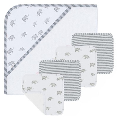 - Set includes hooded towel and 4 washcloths