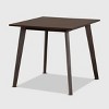 A simple, streamlined design makes the Britte dining set an easy addition to any dining space. Featuring seating for up to four, the Britte set is constructed from solid rubberwood in an elegant dark oak brown finish. Each chair is upholstered in a soft neutral polyester fabric that complements the dark wood finish. Curved seats and backrests provide ample dining comfort. Inspired by mid-century design, splayed legs give the table and chairs a cool, retro profile. The set’s compact size makes it well suited for small nooks and homes. The Britte dining set is made in Malaysia and requires assembly. Chair dimensions: 30.31" high x 19.49" wide x 21.06" deep; Seating dimensions: 17.32" wide x 16.93" deep x 17.91" high (from floor); Back: 13.58" high; Legs: 16.34" high; Table dimensions: 29.53" high x 31.5" wide x 31.5" deep; Legs: 28.82" high;