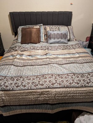 submitted byThelma - 8 years agoA: I don't an exact weight, but it is a perfect weight so that in the summer it is not heavy like a comforter would be and in the winter you can put a down comforter under it and it looks the same. I like that it is big enough to hang over the sides and I love the color pattern.