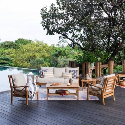 Crafted from solid teak wood sourced from sustainable plantation forests, each piece showcases the durability and natural beauty of genuine teak — a mark of quality that stands out in any setting. The thick, zippered polyester cushions provide plush comfort and effortless maintenance, making it easy to enjoy your outdoor space all season long.