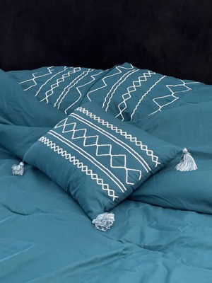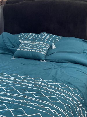 - Teal blue comforter set with white rickrack stripes and diamonds
