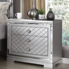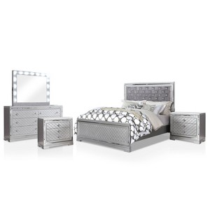 Ever dreamed of being a movie star. You'll sure feel like one with this stunning, designer-inspired glam bedroom set. Featuring a beautiful bed with a button tufted headboard, the set includes 2 nightstands plus a 6-drawer dresser and lighted mirror, each gorgeously detailed to match the bed. In silver and gray with mirrored trim, the set boasts diamond lattice details and faceted acrylic buttons and knobs that sparkle like crystal to complete the look.