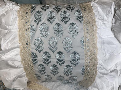 - Throw pillows featuring gathered fabric and embroidery with lace trim and ruffles