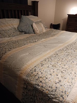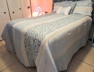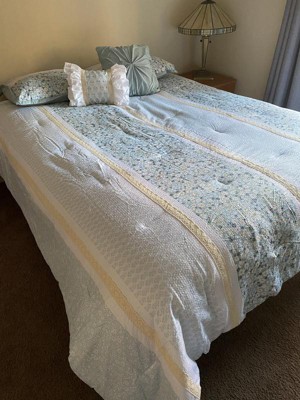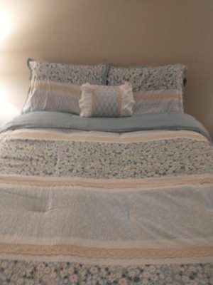 [This review was collected as part of a promotion.] This set comes with a comforter, throw pillows and shams. The thickness keeps me warm on cool nights. The seersucker top is fairly soft which I find appealing. I wish the bottom was the same material. It doesn’t feel quite as high quality underneath. It is true to size. The comforter has a classic floral design and is accentuated with some lace detail. I enjoy the flower portion but the lace color is off white and I could do without it. The pillows are fluffy and add a bit of elegance. The shams are a good size and can be easily cleaned if needed. I would recommend this to anyone who has a classic design style in their bedroom.