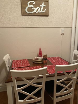 The Hartman Cherry and White 5 pc set is a chic dining set that comes with a rectangular table and four chairs. It is made of MDF and Acacia wood veneer in a cherry finish for the tabletop and chair seats with a white back and legs to add a touch of contrast. The chairs have a double “x” back to provide interest and detail. Some assembly required
