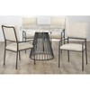 Mixed media cohesively comes together making a statement with the Indra Dining Set by Lifestorey. Simplicity and functionality combine to embody the faux marble top and black finished metal pedestal base. Industrial flare accentuates the metal base which allows for maximum design flow, while the thick top mimics real stone with distinctive gray tonal variations. Generously padded chair seats and backs with arms provide added comfort with a slender black metal frame.