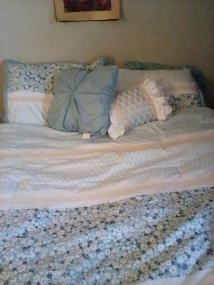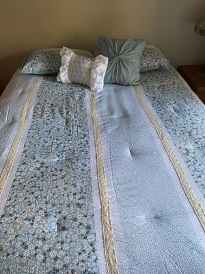 [This review was collected as part of a promotion.] This set comes with a comforter, throw pillows and shams. The thickness keeps me warm on cool nights. The seersucker top is fairly soft which I find appealing. I wish the bottom was the same material. It doesn’t feel quite as high quality underneath. It is true to size. The comforter has a classic floral design and is accentuated with some lace detail. I enjoy the flower portion but the lace color is off white and I could do without it. The pillows are fluffy and add a bit of elegance. The shams are a good size and can be easily cleaned if needed. I would recommend this to anyone who has a classic design style in their bedroom.