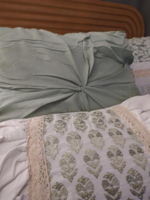 - Throw pillows featuring gathered fabric and embroidery with lace trim and ruffles