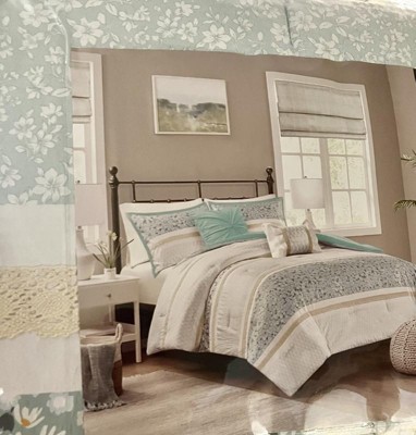 Featuring three different floral and botanical print designs separated by lace trims, this Madison Park seersucker microfiber comforter set exudes shabby chic/farmhouse style that adds a touch of elegance to any bedroom. The two decorative pillows feature gathered fabric and embroidery with lace trim and ruffles, adding to the overall charm of the set. Colors featured in this set include various shade of greens, yellows, and whites.