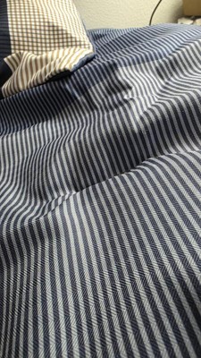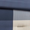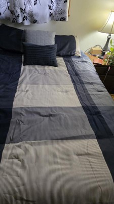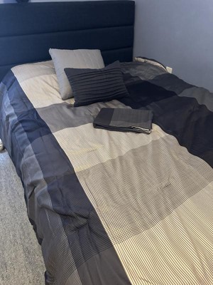 The colors are a lot darker in person (blue close to black) than the photos online. It’s a pretty set though and has a satin like texture to it. Lightweight and doesn’t sleep too hot. I like that it is machine washable (I have yet to wash so not sure how it holds up) and comes with matching shams and pillows. Overall a nice, neutral set just darker than I hoped.