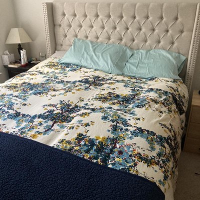The duvet is soft and the print is beautiful. I have cats that sleep on my bed so I was worried about the amount of white space but the material seems to deflect the fur, so that was a bonus. It looks nice in the picture but it’s really beautiful in person. I took a picture of the print so you can see the colors a little better. There’s a burgundy in the branches and a little pop of red that don’t really show in the pictures on the site.