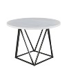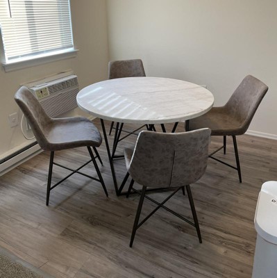 A dining set that is both beautiful and comfortable, Ramona features mid-century modern styling that will instantly update any dining area. This mixed media set features a round white marble top and architecturally shaped angles in the base. The ergonomically shaped faux leather chairs are a perfect complement. Your purchase includes one dining table and four side chairs.