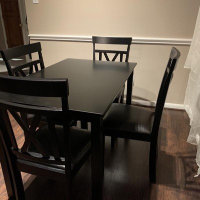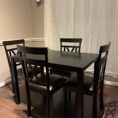 Our Rosie modern and contemporary 5-piece dining set celebrates simplicity by combining timeless and contemporary elements. The chairs' high, X-back design offers comfort and grace. The table's understated smooth, rectangular top represents refinement. Dark-, wenge-finished wood matches perfectly with faux leather padded seats. Table and chairs share square tapered legs for a modern essence. Made in Malaysia, the Rosie dining chair requires assembly. Table Dimensions: 29.13" High x 43.31" Wide x 27.56" Deep; Legs: 28.35" High; Weight: 39.68 lbs.; Chairs Dimensions: 37.01" High x 16.85" Wide x 19.29" Deep; Seating Dimensions: 18.5" High (from Floor) x 16.93" Wide x 15.16" Deep; Back: 37.01" High; Legs: 16.54" High; Weight: 11.9 lbs.