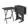 Make entertaining simple and easy with the Winsome Wood Dorian 5-Piece Snack Table Set. A perfect companion piece for a casual meal in front of the TV or on the patio. This versatile set includes four folding snack tables with oversized tops. The classic rectangular shape of these snack tables has gently curved sides, rounded corners and are oversized for more table space. Ideal for setting out appetizers, so bring out the set and pull up the tables as you and your guests sit back. Great for daily use and compact enough to store in the closet. For convenience an upright stand is an innovative addition to this set as it serves as a rack to store the folded tables discretely when not in use. Constructed of solid and composite wood in an oyster gray finish, this set of foldable tables easily open up to X-frame bases which make these table not only look good but also help with stability. Conveniently packed and shipped in 1 box. Tables arrive ready to use. Minimal assembly is required for the stand and hardware necessary is included. Replacement part request can be submitted directly to the manufacturer within 60 days from date of purchase.