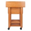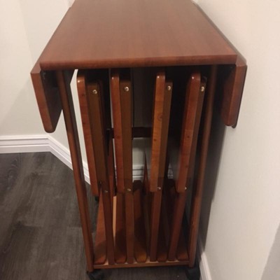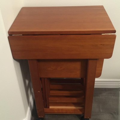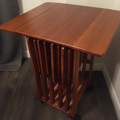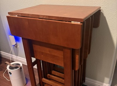 Make entertaining simple and easy with the Winsome Wood Sophia 5-Piece Snack Table Set. A perfect companion piece for a casual meal in front of the TV or on the patio. Four folding snack tables great for daily use and compact enough to store in the closet. An upright stand is an innovative addition to this set as it serves as a rack to store the folded tables discretely when not in use underneath the double-drop leaf top that provides extra table top space when needed. Keep glasses, ice, hors d'oeuvres, and serving dishes on the expanding table top while using the individual folding snack trays for dining. Transport from one room to another as the stand has four plastic casters for easy mobility, 2 of which lock to keep the unit firmly in place. All the tables have smooth, rounded edges and are made of solid wood to last over time with repeated use. Finished in a warm teak finish. Conveniently packed and shipped in 1 box, that includes the hardware necessary for assembling the stand. Tables arrive ready to use. Replacement part request can be submitted directly to the manufacturer within 60 days from date of purchase.