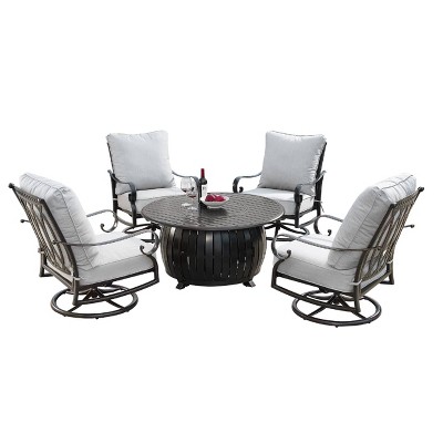 Whether your outdoor retreat is located in the mountains, on the coast, or somewhere in between, this fire table set will extend your evenings with friends and family around the fire. With this addition you can enhance your outdoor setting with even more ambiance and relaxation. This fire table set comes with an Outdoor Aluminum 48 in. Rectangular Fire Table Set with Four Deep Seating Swivel Rocking Chairs, Fire Beads, Lid, Propane Tank Cover and Table Fabric Cover. The dimensions for the fire table are: 36" L x 48" W x 24.5" H, 83 lbs. Each chair dimensions are: 28.3" L x 33.8" W x 34.2" H, 32.3 lbs. The chair seat is 12.6" H from the seat to the floor.