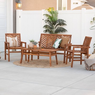 Come together with this four-seater, five-piece outdoor dining set from Saracina Home. It includes four contoured armchairs with a chevron design and one slat style table the features a hole for an outdoor umbrella so you can block out harmful UV rays. All the pieces are made of solid acacia wood so they are naturally weather resistant and a great addition in the backyard, by the pool, or on a back porch. Properly care for your outdoor acacia furniture by keeping it out of severe weather conditions and applying teak oil every 2-3 months.