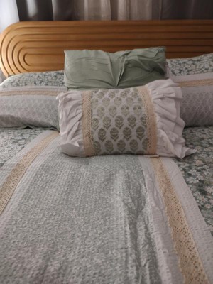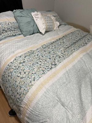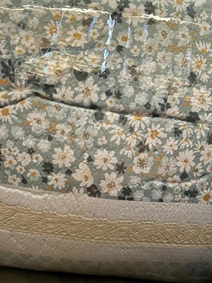 Featuring three different floral and botanical print designs separated by lace trims, this Madison Park seersucker microfiber comforter set exudes shabby chic/farmhouse style that adds a touch of elegance to any bedroom. The two decorative pillows feature gathered fabric and embroidery with lace trim and ruffles, adding to the overall charm of the set. Colors featured in this set include various shade of greens, yellows, and whites.