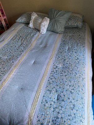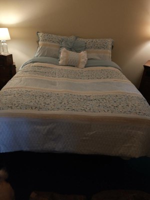 [This review was collected as part of a promotion.] This set comes with a comforter, throw pillows and shams. The thickness keeps me warm on cool nights. The seersucker top is fairly soft which I find appealing. I wish the bottom was the same material. It doesn’t feel quite as high quality underneath. It is true to size. The comforter has a classic floral design and is accentuated with some lace detail. I enjoy the flower portion but the lace color is off white and I could do without it. The pillows are fluffy and add a bit of elegance. The shams are a good size and can be easily cleaned if needed. I would recommend this to anyone who has a classic design style in their bedroom.