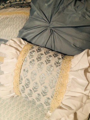 - Throw pillows featuring gathered fabric and embroidery with lace trim and ruffles