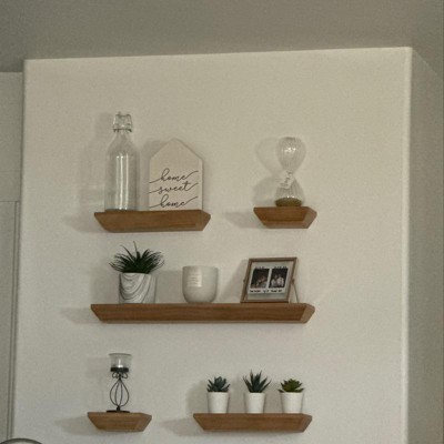 A great combination of function and timeless design, this 5-Piece Wedge Shelves from Threshold™ makes an elegant addition to your home. This five-piece shelf set comes in varying sizes to easily hold items like books, plants and smaller decor. Crafted from a wooden frame, these shelves are easy to attach to the wall using the included anchors and screws — simply use them in the living room, study area or any other space.