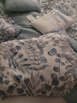 Featuring an all over leafy, floral, botanical print, this seersucker microfiber comforter set exudes a modern farmhouse style that adds a touch of elegance to any bedroom. The two decorative pillows feature gorgeous embroidery that complements the bedding print, adding to the overall charm of the set. Colors featured in this set include various blue, violet, mauve, and whites. The comforter and pillows are filled with hypoallergenic polyester filling that is treated to be dustproof, ensuring a restful and comfortable sleeping experience. This OEKO-Tex certified bedding set can also be machine washed and is extra durable for long lasting comfort.