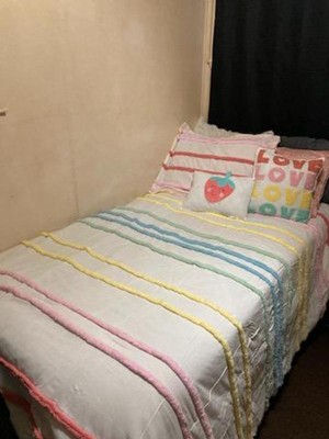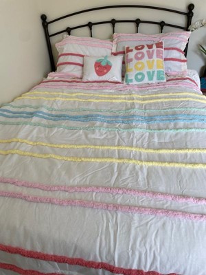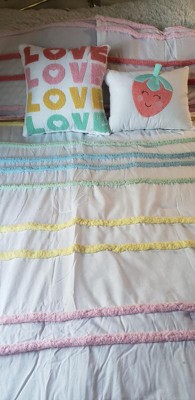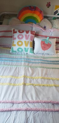 [This review was collected as part of a promotion.] My daughter is almost 4 and loves rainbows and all things girly! This Urban Kids Haisley Comforter Set is precious. It has two bright pillows, one with a strawberry and the other with rainbow Loves. It would match many room colors or bring color to a colorless room!