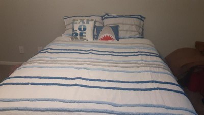[This review was collected as part of a promotion.] My four year old is very into sharks so when we were ready to upgrade her bed and went looking for a new bedding set, this one caught our eye right away. The blanket is nice and soft with very pretty details. It seems well made, with no wear after using it this past month and running it through the wash. It came with two throw pillows, one is a shark, that were a huge hit. We love this set!