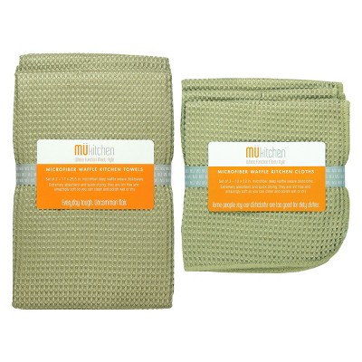 Stock up your kitchen essentials with the Waffle Microfiber Dish Cloth and Kitchen Towel (Set of 5) in Pebble Beige from MUkitchen. These highly absorbent microfiber kitchen cloths and towels are generously sized to wash and dry even the tallest stack of dishes. The waffle texture works like a scoop picking up dirt and grime whether being used wet for dishes or dry for dusting and cleaning. Lint-free, quick-drying, super absorbent and designed to bring out the sparkle in your glassware. After using they can be rinsed and wrung out to quickly dry for the next use.