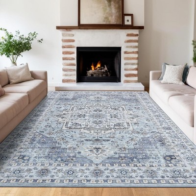 5x7 Washable Area Rug – Marble Distressed Boho Farmhouse, Ultra-Thin Non-Slip Geometric Carpet for Living Room, Kitchen, Dining – Blue