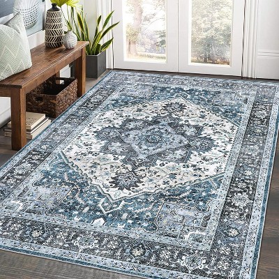 5x7 Washable Vintage Ombre Area Rug, Non-Slip, Low Pile Boho Floral Print for Bedroom, Living Room, Dining, Laundry, Teal