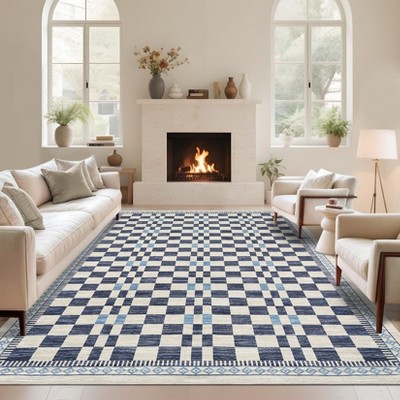 5x7FT Modern Washable Area Rug for Living Room, Bordered Print Floor Rug with Non Slip Backing, Low Pile Stain Resistant Carpet for Dorm, Blue