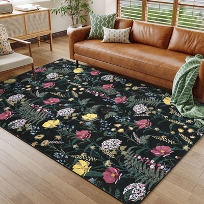 5x7FT Modern Washable Area Rug for Living Room, Floral Printed Floor Rug with Non Slip Backing, Low Pile Stain Resistant Carpet for Office, Black