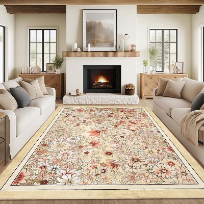 5x7ft Washable Velvet Rug, Non-Slip Soft Carpet, Scalloped Low-Pile Bordered Folded Imitation Print Rug for Dining Room Bedroom Entryway, Beige