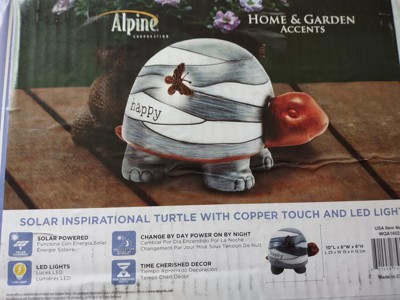 6" "Happy" Turtle Statue with Solar-Powered LED Light Heathered Gray/White/Copper - Alpine Corporation: Polyresin Garden Decor